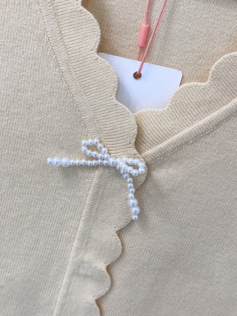 Soft, sweet, and effortlessly chic — this butter yellow scallop cardigan is a wardrobe favorite that brings sunshine to any outfit. The warm buttery hue with delicate scallop edges add a feminine, whimsical touch. Adorned with pearl-accented bow buttons, each closure feels like a little moment of charm, elevating classic knitwear to something truly special.