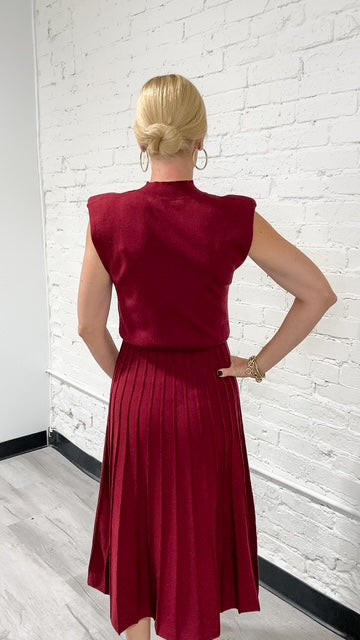 Our cranberry knit maxi dress is a stunning addition to your Fall wardrobe. Sleeveless (perfect for us Floridians) with a pleated maxi skirt, truly makes this a unique & flattering piece. Pair with chocolate brown boots or black. Add a blazer for a chic additional layer.