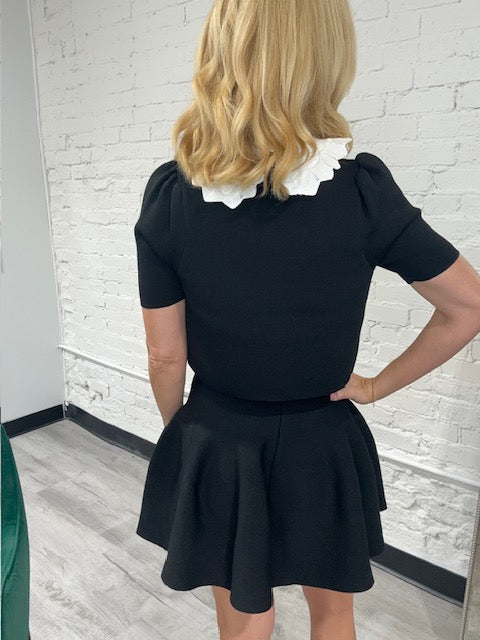 Effortlessly chic and feminine- this two piece knit skirt set features a lace trimmed collar detail with fun flouncy skirt. It makes for the perfect workday dressy attire or a stylish night out.
