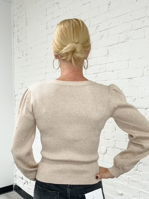 For all our pearl girls- this pearl detail sweater is a chic elevated Fall piece. Super soft, ribbed material with pearls on front and sleeves. (clean back)