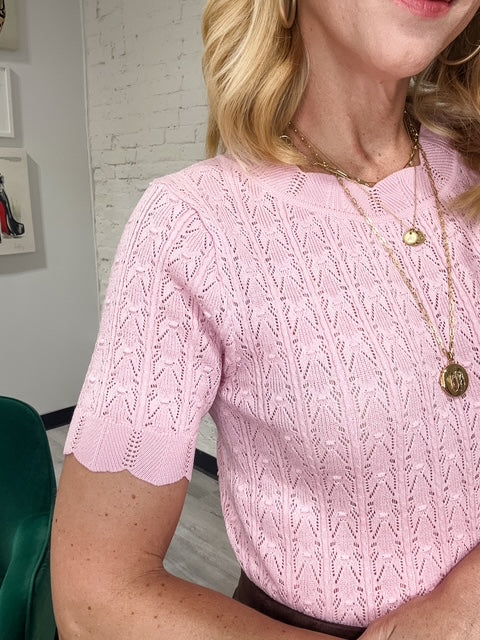 Our Pink Pointelle knit top is a perfectly lightweight top for Fall transitional weather. Pair with jeans, or our faux cranberry leather pants for a fun color combo.